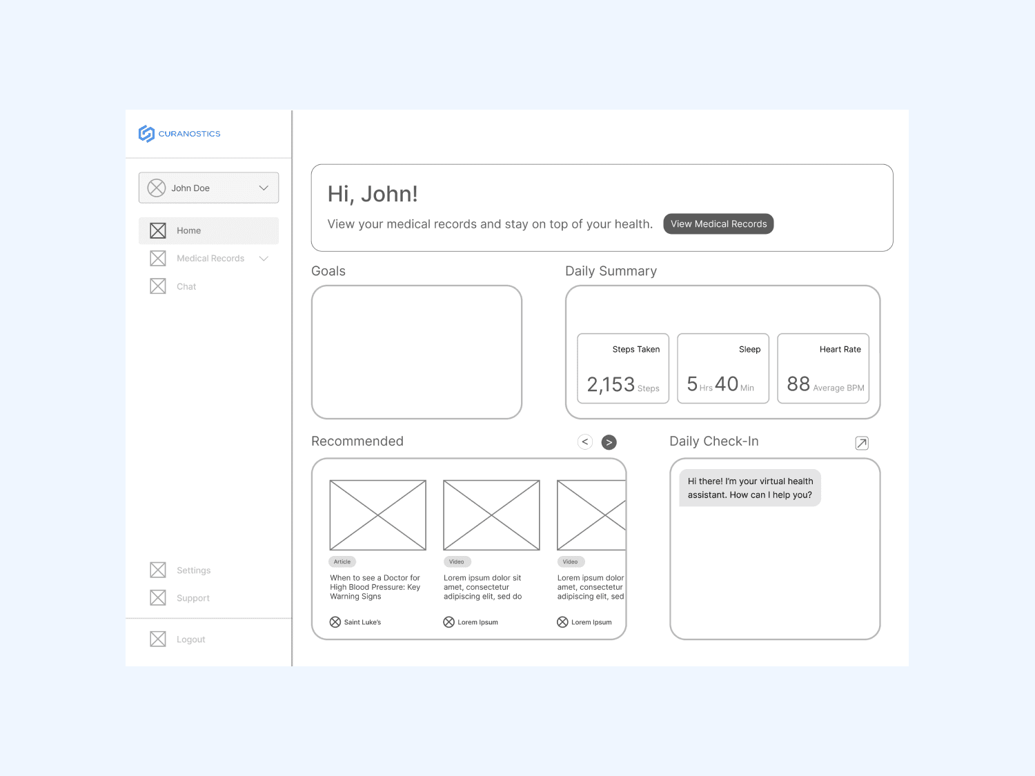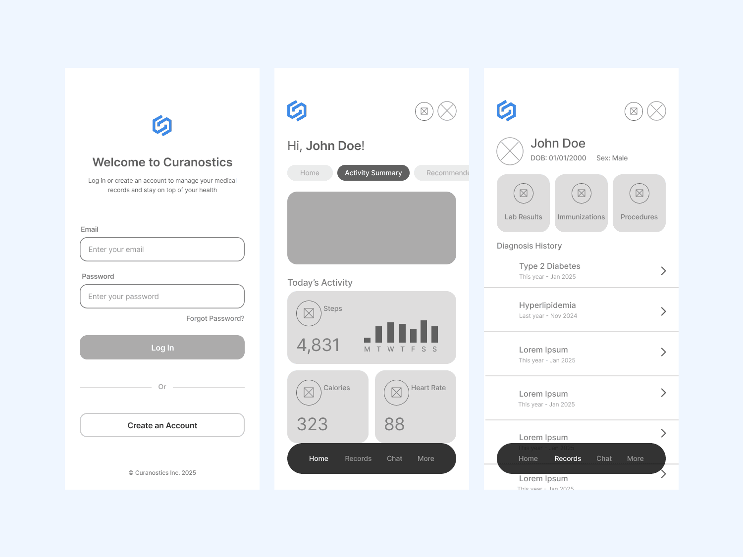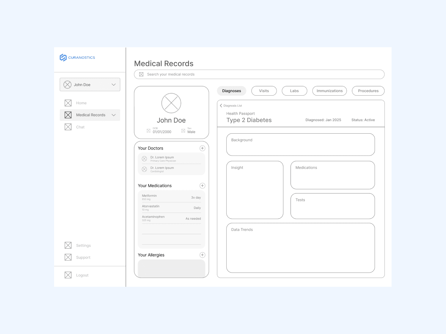 Curanostics is a medical records management platform that allows users to manage their health data securely and efficiently. The platform was in its early development stages, with only a basic framework in place. It lacked a clear user experience strategy, making health records difficult to navigate.