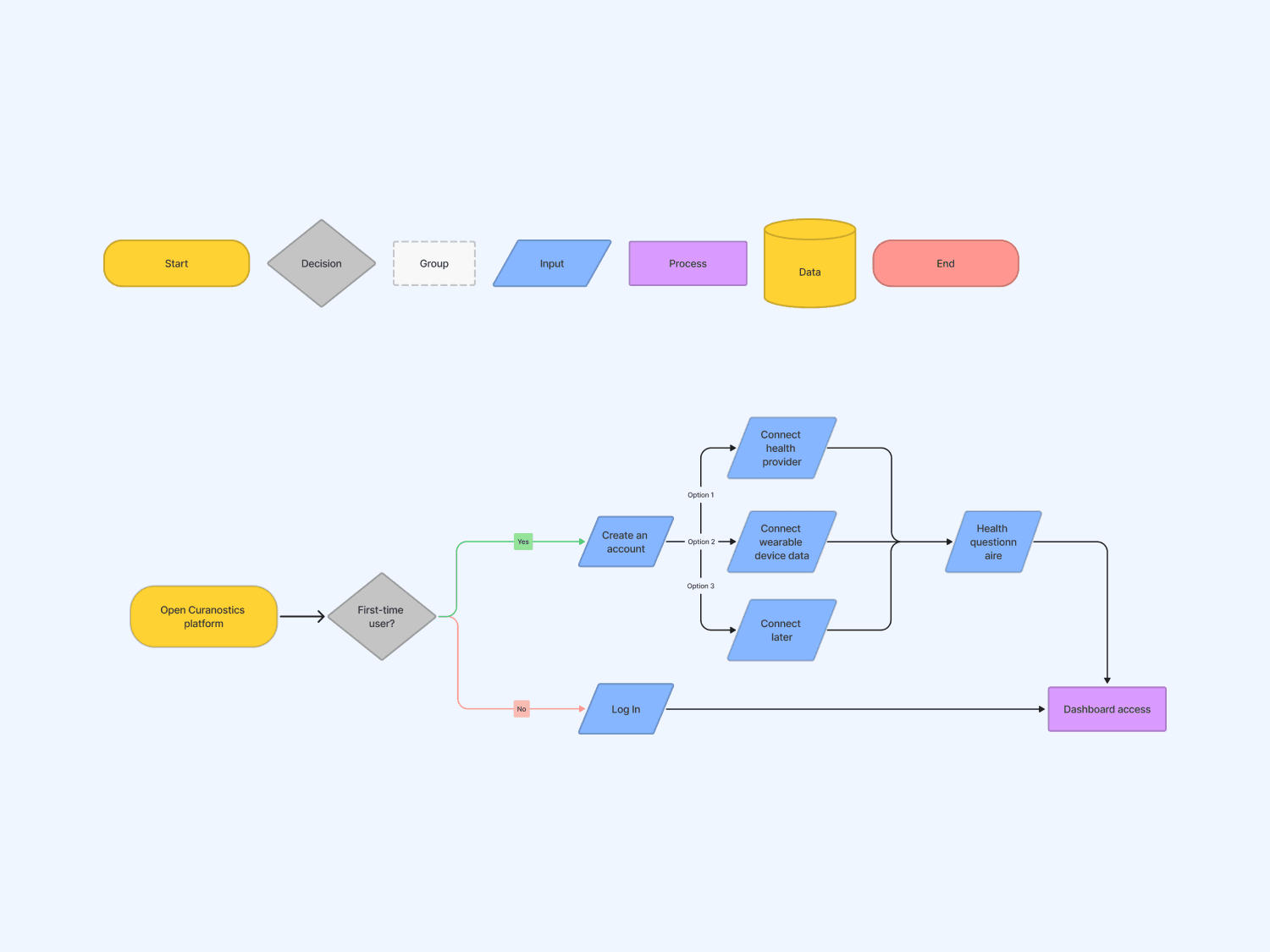 User flows mapped how users create an account, complete onboarding, and securely share their medical records—ensuring a smooth entry into the platform while adhering to privacy regulations.