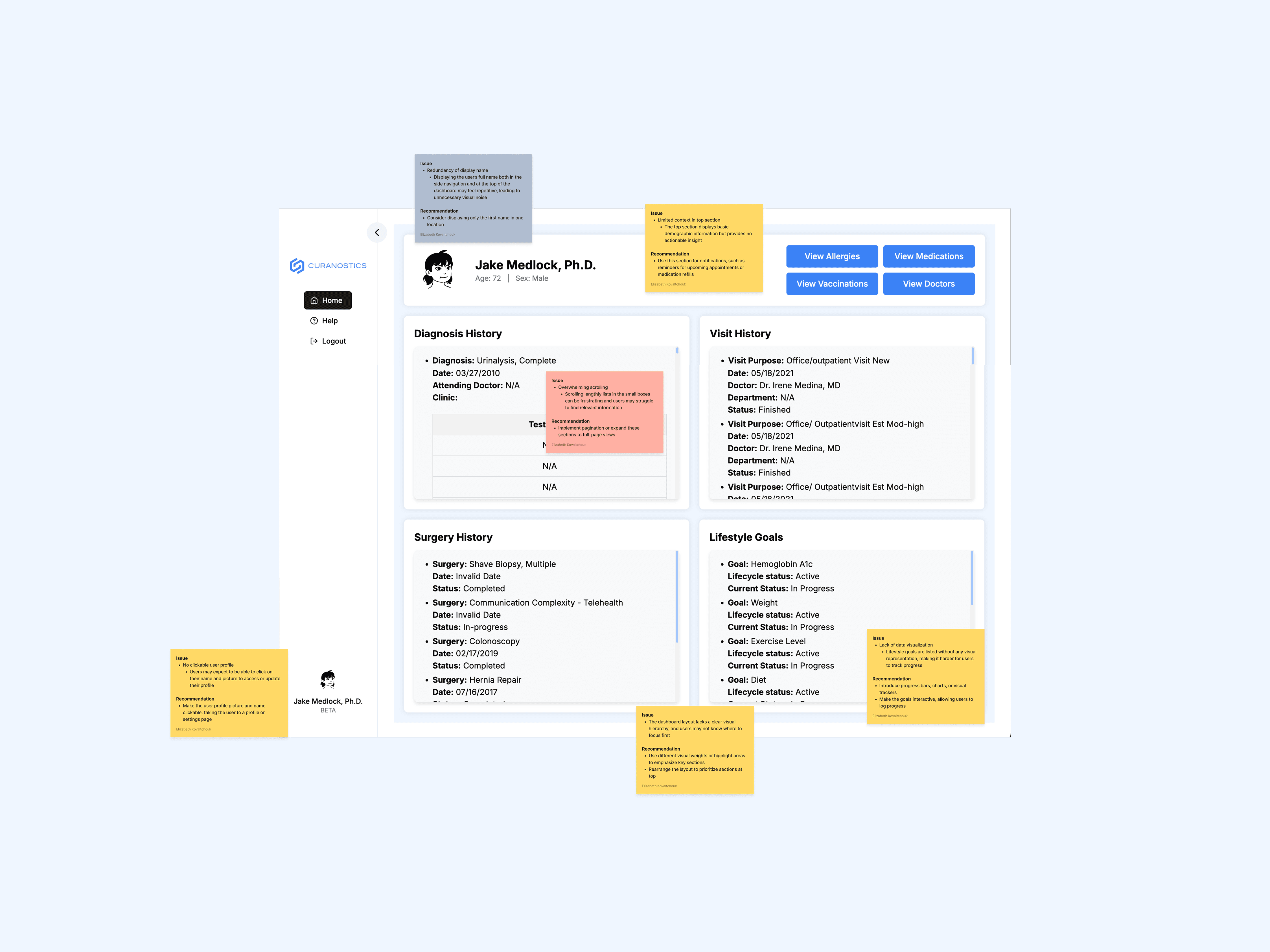 A usability audit was conducted on the beta version of the platform to assess the platform’s user experience, focusing on pain points in navigation, accessibility, and data retrieval. Key considerations included minimizing cognitive load, ensuring clear call-to-action elements, and reducing friction in accessing critical health data.