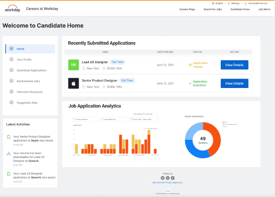 This feature provides users with a centralized space to track all applications submitted through Workday, across different companies. It enhances transparency and control by offering a consolidated view of application status, deadlines, and required next steps.